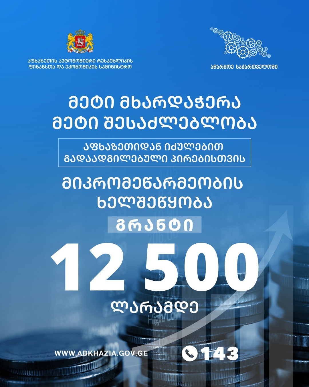 - გაცნობილია ვებ გვერდზე - www.abkhazia.gov.ge გამოქვეყნებულ - „აფხაზეთიდან იძულებით გადაადგილებული პირებისთვის მიკრომეწარმეობის ხელშეწყობა“ პირობებს, შესაბამისობის კრიტერიუმებსა და თანადაფინანსების პირობებს;